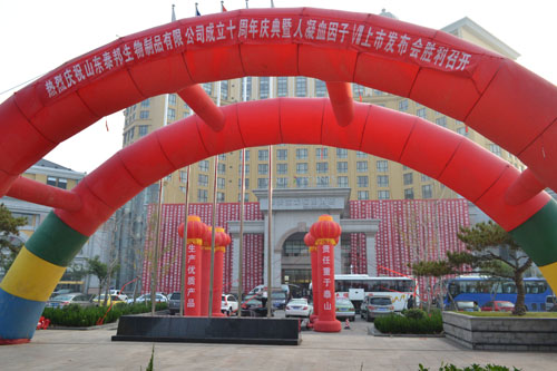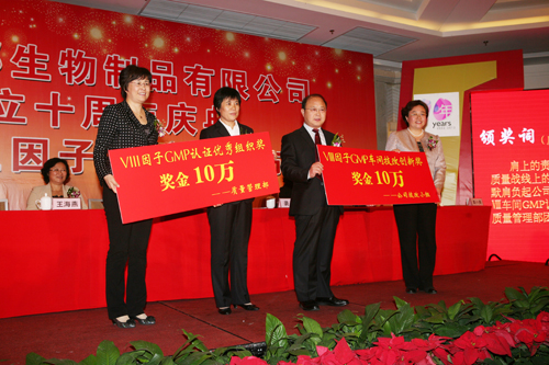 慶典會議在山東省泰安市福朋酒店舉行。本次慶典會議的參會嘉賓有中國輸血協(xié)會朱慶生理事長、衛(wèi)生部醫(yī)政司血液管理處陳斌、泰安市副市長周靜、王海燕副局長、山東衛(wèi)生廳副廳長襲燕、中國食品藥品檢定研究院生物制品檢定所所長沈琦、中國醫(yī)學科學院輸血研究所所長鄭忠偉等相關(guān)領(lǐng)導,以及各省市醫(yī)療衛(wèi)生部門、各省市血液中心的主任等相關(guān)人員。慶典會議由山東泰邦王岢義副董事長主持,會議開始前,在泰邦生物集團高小英董事長的帶領(lǐng)下,參會嘉賓一行來到山東泰邦的辦公樓和廠房參觀,共同鑒證并分享山東泰邦作為民族生物制藥企業(yè)在十年發(fā)展歷程中的進取與收獲。明亮的辦公樓大廳墻壁上,一幅幅展示板圖文并茂的向參觀的嘉賓展示了山東泰邦十年發(fā)展歷程中取得的一個又一個驕人成績。